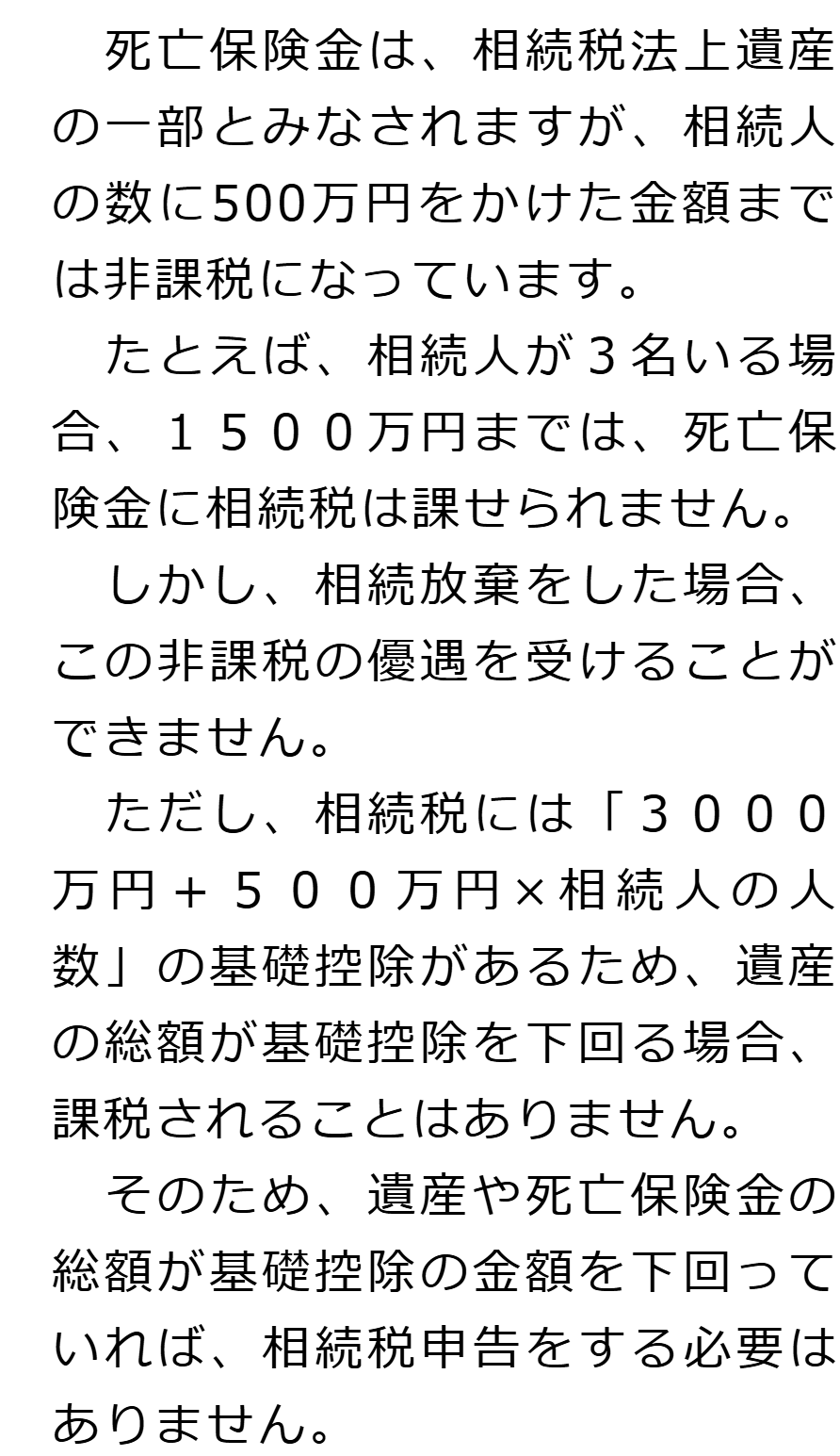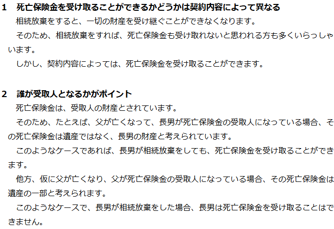 相続放棄と生命保険に関するQ&AQ相続放棄をすると死亡保険金を受け取ることはできなくなりますか?Q相続放棄をして死亡保険金を受け取った場合、相続税申告は必要ですか?Q相続放棄をした場合、死亡保険金の非課税枠は使えますか? Q相続放棄をすると死亡保険金を受け取ることはできなくなりますか?AQ相続放棄をして死亡保険金を受け取った場合、相続税申告は必要ですか?AQ相続放棄をした場合、死亡保険金の非課税枠は使えますか?A Q&A(目次)Q&Aトップ相続放棄と生命保険に関するQ&A 受付時間 平日 9時~21時、土日祝 9時~18時 夜間・土日祝の相談も対応します (要予約) 所在地 〒060-0808 北海道札幌市北区北八条西4‐1-1パストラルビルN8 2F 0120-41-2403 お問合せ・アクセス・地図